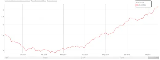 Súčasný trend rastu ceny Bitcoinu nespôsobil len nárast presunu mincí, ale aj počet aktívnych peňaženiek. Kým koncom januára tohto roka bolo aktívnych len 570 tisíc peňaženiek, tak aktuálne od začiatku mesiaca je to už viac ako 800 tisíc. Dokonca 3. 7. 2019 bolo aktívnych až 853 tisíc.