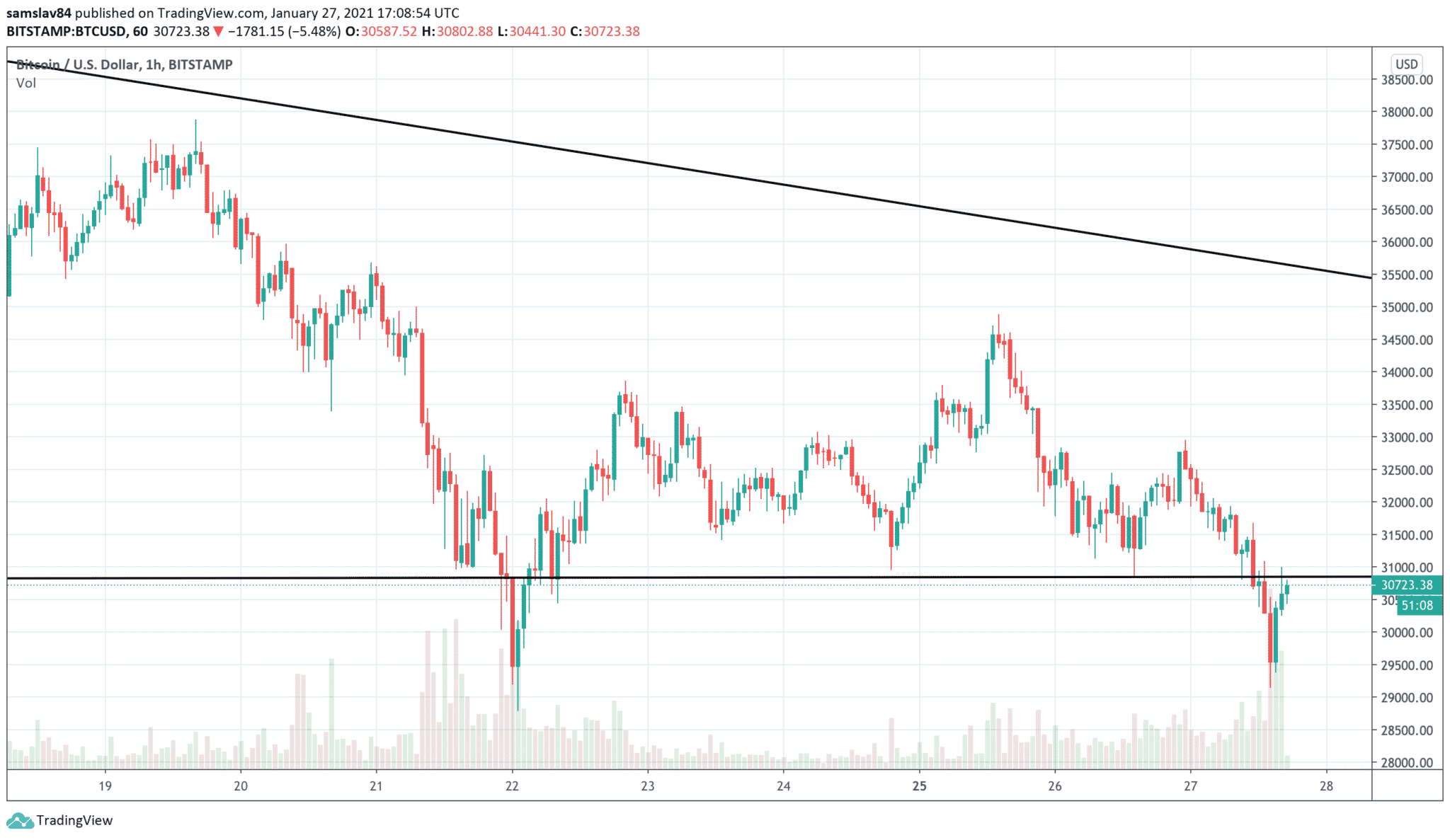 Aj preto sa na internete rozpútala veľká panika, keď Bitcoin skutočne klesol cca 900 dolárov pod tridsaťtisícovú cenovku. Neohrial sa tam však veľmi dlho. Aktuálne je už späť.