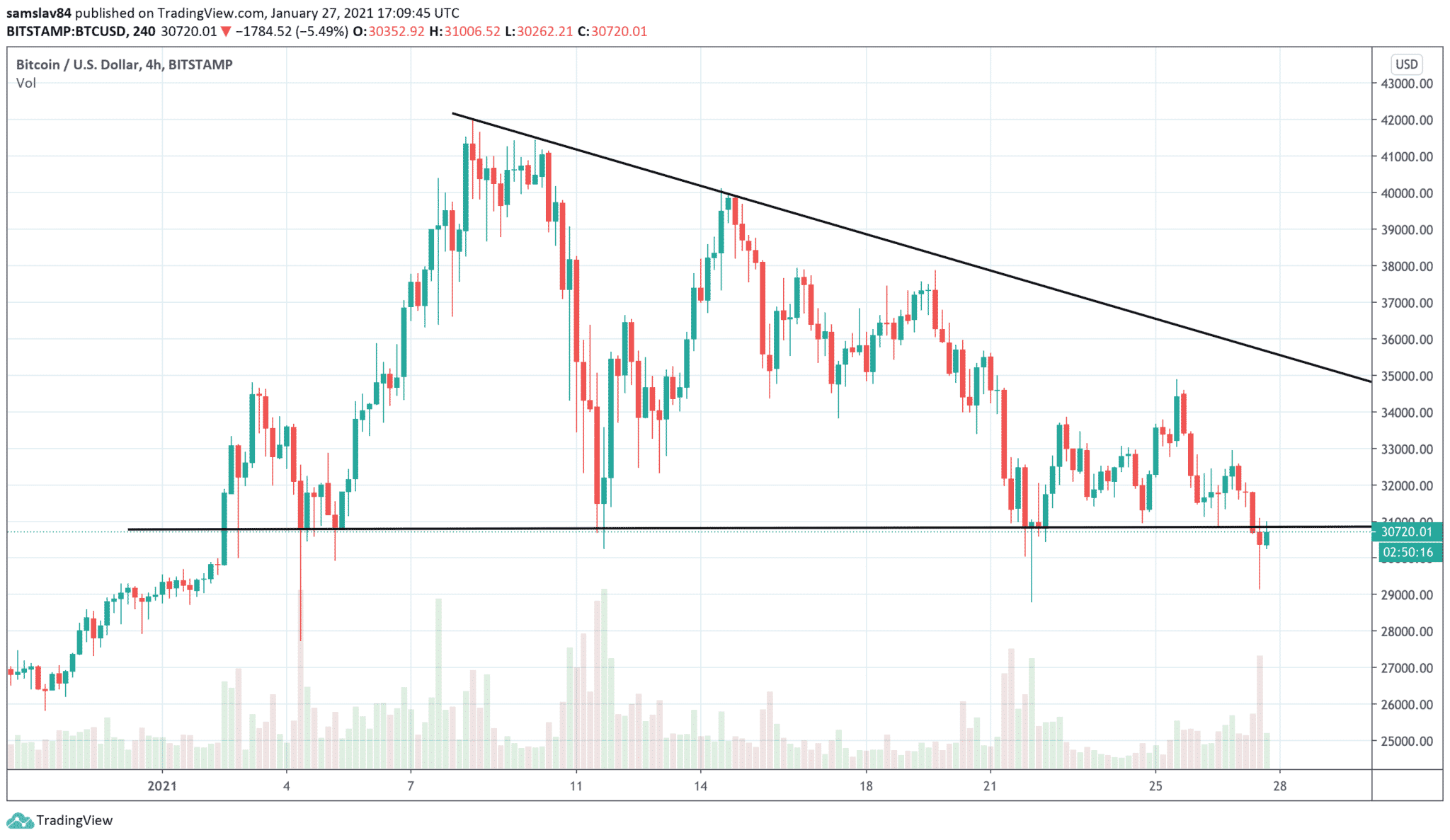Hladina 30 000 $ sa často označuje za kľúčovú. Toto okrúhle číslo má podľa všetkého silný psychologický vplyv na obchodníkov. Ak by pod ňu Bitcoin padol, potvrdil by sa klesajúci trend a v najbližších týždňoch/mesiacoch sa môžeme s ďalším historickým maximom rozlúčiť. Existujú dokonca aj takí, ktorí v prípade poklesu pod 30k veštia niekoľkoročný mear market.