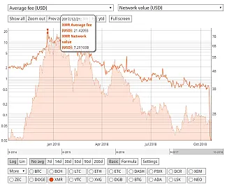 Desiata najväčšia kryptomena (podľa metriky Coinmarketcap) – Monero – prichádza so skvelou správou. Vďaka úspešnému upgradu siete, ktorý sa odohral 18. októbra, sa transakčné poplatky v tejto sieti znížili o úctyhodných 97 %. Vychádzajúc zo štatistík vedených stránkou CoinMetrics, používatelia zaplatia namiesto 60 USD centov len 2 centy. Keď si to porovnáme s hodnotami na sklonku minulého roku (obrázok nižšie), rozdiel je dramatický.