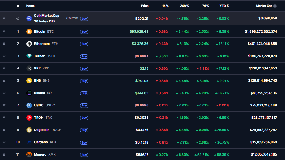 Monero je 11. najväčšia kryptomena. Zdroj: coinmarketcap.com