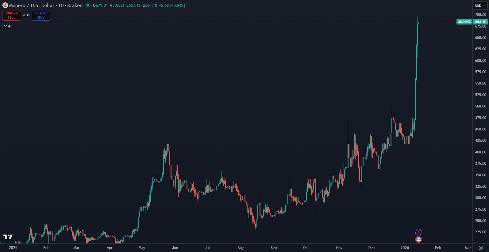Monero zaznamenalo výrazný cenový rast a dostalo sa na nové historické maximum 703 dolárov, ukazujú údaje z TradingView. Táto úroveň prekonala predchádzajúci rekord z roku 2021 na úrovni približne 518 dolárov. Trh tak jasne ukázal, že investori v posledných týždňoch výrazne menia svoje preferencie v prospech kryptomien zameraných na súkromie.