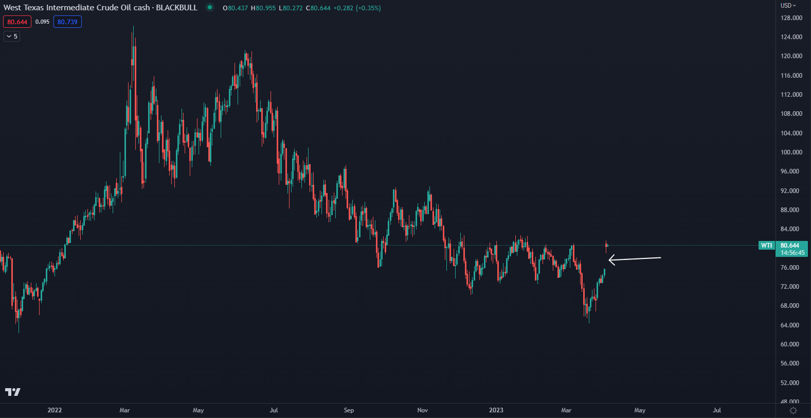 Ako vidíme podľa údajov TradingView, trhová cena ropy WTI vytvorila cenovú medzeru a okamžite stúpla nad 80 dolárov. Trhy reagovali na plán zníženia produkcie zo strany Saudskej Arábie, Ruska, Spojených arabských emirátov (SAE), Iraku, Kuvajtu, Ománu a Alžírska. V reakcii na toto rozhodnutie hovorca Bidenovej administrátivy vyjadril nad situáciou znepokojenie.