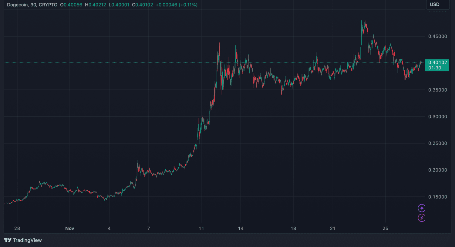 Cena Dogecoinu už zaznamenala masívny nárast hodnoty o 210,74 % po Trumpovom víťazstve v prezidentských voľbách USA. Keďže sa očakáva, že Bitcoin dosiahne 100 000 dolárov pred koncom Q4, mnoho kryptonadšencov očakáva, že prebiehajúca rally Dogecoinu bude tiež pokračovať. Ak bude Dogecoin nasledovať kroky Bitcoinu, tento meme coin by mohol zaznamenať masívny skok o 930 % zo svojej súčasnej úrovne a zasiahnuť úroveň 4,38 dolára.
