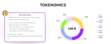 Celková fixná zásoba tokenu DOGE20 predstavuje 140 miliárd tokenov, z ktorých 35 miliárd sa vyčlenilo do predpredaja. Na rozdiel od neobmedzenej zásoby Dogecoinu pevná zásoba DOGE20 pomáha predchádzať inflácii a má potenciál zvýšiť dopyt po tokene DOGE20, čo môže pozitívne ovplyvniť jeho hodnotu. Tokenomika meme coinu Dogecoin20 je navrhnutá tak, aby odmeňovala držiteľov tohto tokenu: 25 % z celkovej zásoby sa uvoľnilo do predpredaja, 25 % je určených na marketing, 25 % poslúži ako finančná rezerva, 15 % sa použije na stakingové odmeny a 10 % na burzové listingy.