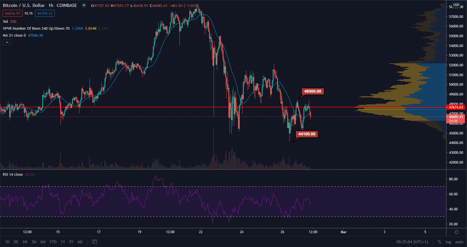 Údaje TradingView ukazujú, že cena BTC 26. februára klesla na nízku úroveň 44,150 dolárov. Následne sa odrazila od kľúčovej podpory, ktorá pomohla digitálnemu majetku zotaviť sa späť nad 48,500 dolárov. Odvtedy však cena znovu klesá a analytici všeobecne očakávajú, že až cena 50,000 dolárov bude stabilnou podporou, ktorá je nevyhnutná pre pokračovanie bullrunu.