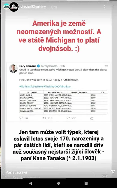 A tu je ďalší post ktorý tvrdí, že v Michigane hlasovali 170-roční ľudia. Opäť, ľahko môže ísť o dezinformáciu. Tvrdenie necituje žiadny zdroj a vyrobiť niečo podobné sa dá aj v skicári. Takže… dôveryhodnosť príspevku je nulová.