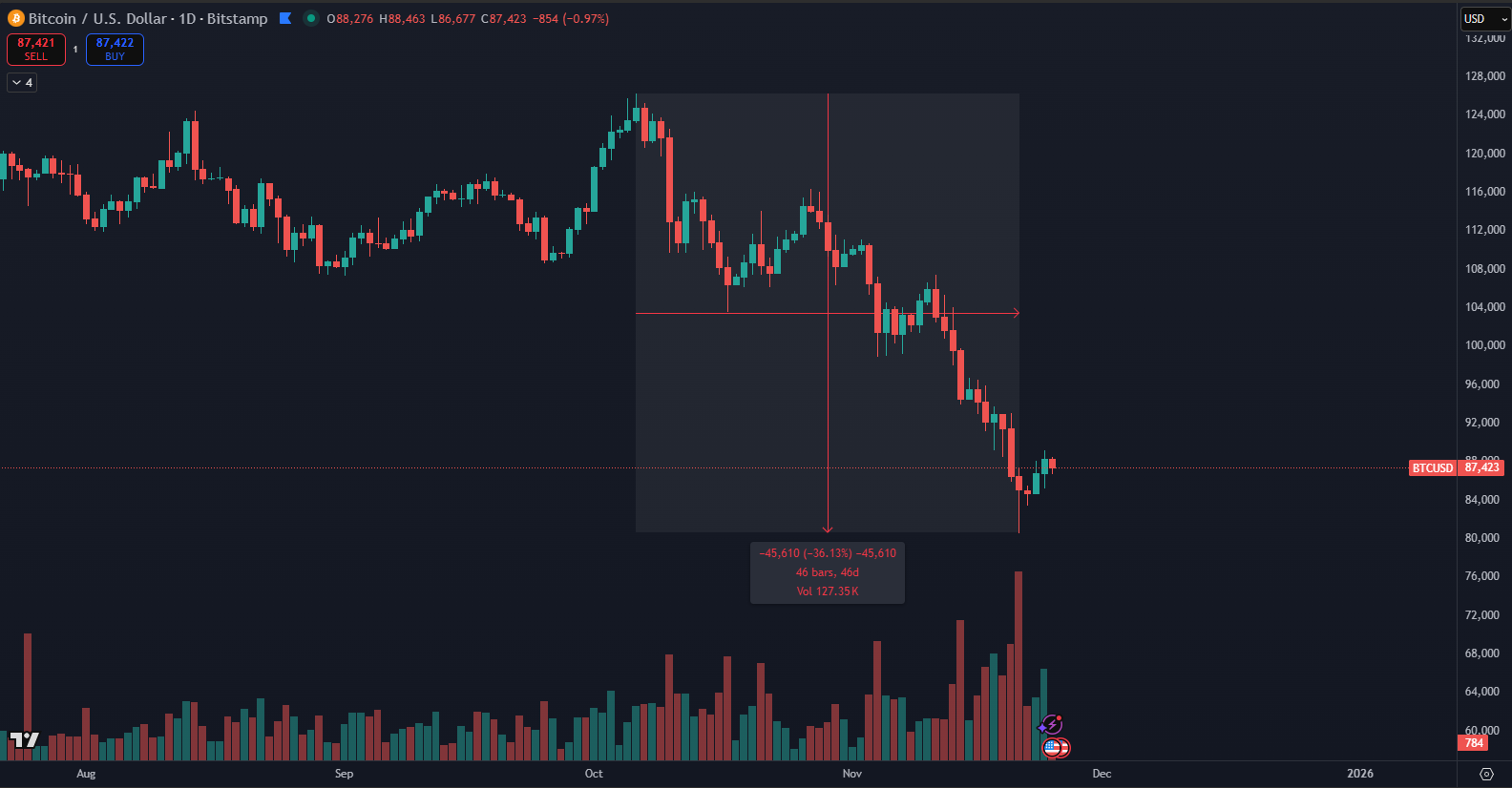 Bitcoin v posledných mesiacoch prekvapil investorov nečakanou prudkou korekciou, ktorá je podľa platformy TradingView najvýraznejšia od roku 2022. Z cenového vrcholu na úrovni 126 200 dolárov sa digitálne aktívum prepadlo až k hranici 80 000 dolárov, čo predstavuje pokles o 36 %.