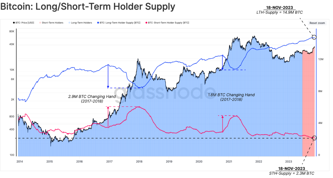 ETF zrejme výrazne pohne s cenami aj predovšetkým vďaka trendu, ktorý sledujeme na metrike ponuky dlhodobých držiteľov. Podiel dlhodobých držiteľov na celkovej ponuke mincí je stále vyšší a dosahuje historické maximá. V novembri 2023 dosiahli držby týchto držiteľov až 14,9 milióna BTC, zatiaľ čo krátkodobí obchodníci držia iba 2,3 milióna BTC.