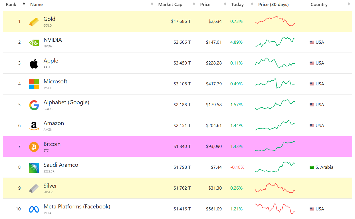 V čase písania tohto článku dosahujú spoločnosti Nvidia, Apple, Microsoft, Alphabet a Amazon vyššiu trhovú kapitalizáciu ako Bitcoin. Ak bude rast kryptomeny pokračovať na nové maximá, čoskoro prekoná aj Amazon a Alphabet. Zároveň je na vrchole rebríčka zlato s obrovským náskokom trhovej kapitalizácie na odhadovanej úrovni 17,68 bilióna dolárov.