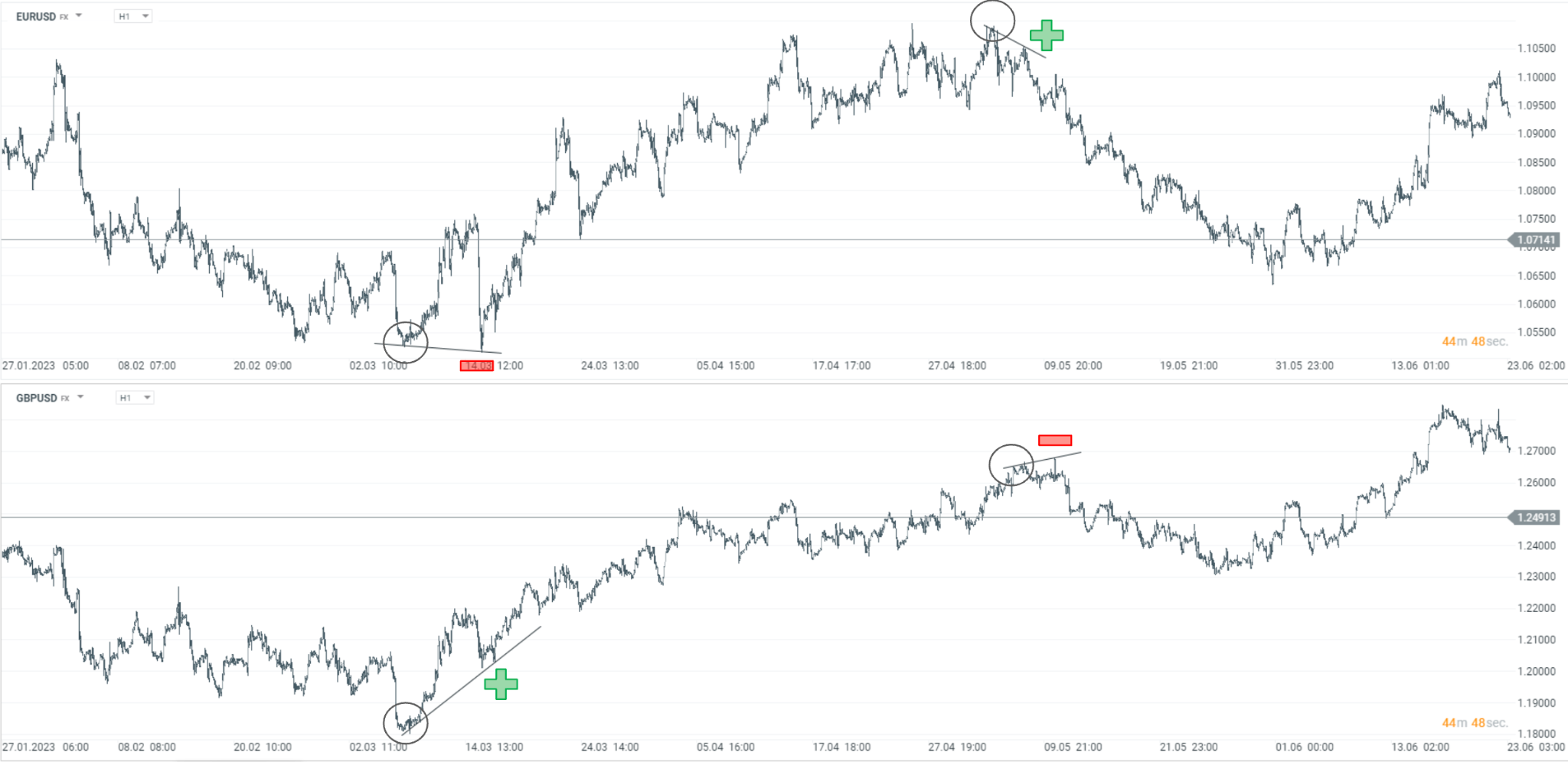 Nižšie vidíme grafy EURUSD a GBPUSD. Na prvý pohľad je tu viditeľná výrazná pozitívna korelácia oboch párov. Obchodník sa môže zamerať na dosiahnutie lokálnych extrémov na oboch pároch a porovnať jednotlivé reakcie na tieto zóny. V prvom prípade vidíme, že pár GBPUSD už reagoval na úroveň podpory a vytvoril nové vyššie minimum označené „+”, avšak korelovaný pár EURUSD vytvára ešte jedno minimum. Táto situácia dáva obchodníkovi lepší vstupný potenciál do obchodu vzhľadom na podstupované riziko.