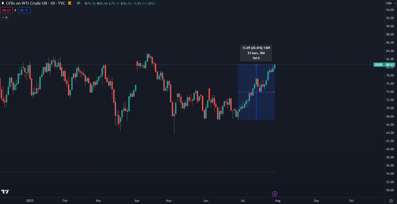 Cena ropy WTI počas posledného mesiaca narástla až o viac ako 20 %. Na cenách benzínu a nafty sa to prejaví s časovým oneskorením, no zmeny v cenách phm už môžeme vidieť aj v súčasnosti. Nafta aj benzín totiž posledné týždne rastú. Ropa sa naposledy obchodovala na takej vysokej úrovni ešte 19. apríla 2023.