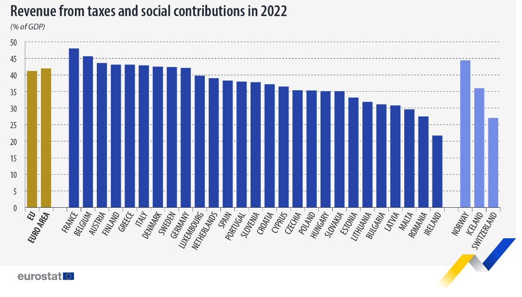 Na základe najnovšej správy od Eurostatu je podiel daní a odvodov na celkovom HDP krajiny v roku 2022 na Slovensku na úrovni 35,1 %. Zo sumy 100 eur si tak štát ukrojí časť v hodnote 35,1 eura. Celkovo máme 8. najnižší podiel v rámce celej Európskej únie. Inak povedané, v slovenskej ekonomike je pomerne veľký priestor na zvyšovanie daní a odvodov. Máme totiž o 6,1 % nižšie daňovo-odvodové zaťaženie ako priemer EÚ.