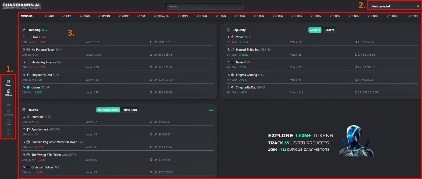 Rozhranie platformy GuardiaNNN.ai je naozaj veľmi jednoduché. Hneď po tom, ako sa dostanete na stránku guardiannn.ai, uvidíte rozhranie, ktoré je na obrázku nižšie. Rozdelili sme ho na 3 základné sekcie: