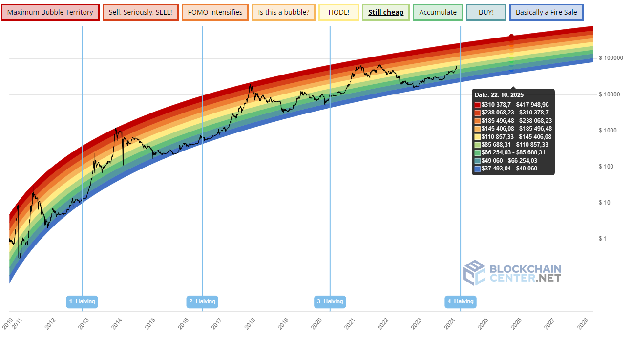 To znamená, že teraz by mal nastať vrchol niekde na rozmedzí 3. a 4. farebného spektra zhora. Keď sa pozrieme aká cena je na tejto úrovni v októbri 2025 zistíme, že vrchol by mohol nastať niekde okolo 185 000 dolárov. Táto cena je opäť v rozmedzí, ktoré určil Peter Brandt. Napriek tomu sa ale nemôžeme na túto analýzu spoliehať, pretože ide o čistú špekuláciu.