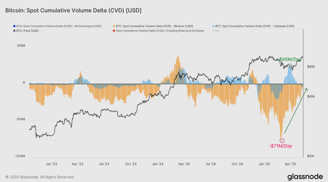 Jedným z kľúčových ukazovateľov je tzv. Spot Cumulative Volume Delta (CVD), ktorý sleduje čistý nákupný alebo predajný tlak na spotových burzách. Analýza tohto ukazovateľa na hlavných burzách Coinbase a Binance odhaľuje zaujímavé kontrasty. Na Coinbase došlo od polovice apríla k stabilnému nákupnému tlaku, pričom CVD dosahoval hodnoty až +45 miliónov dolárov denne. Tento nákupný trend jasne podporil cenový rast.