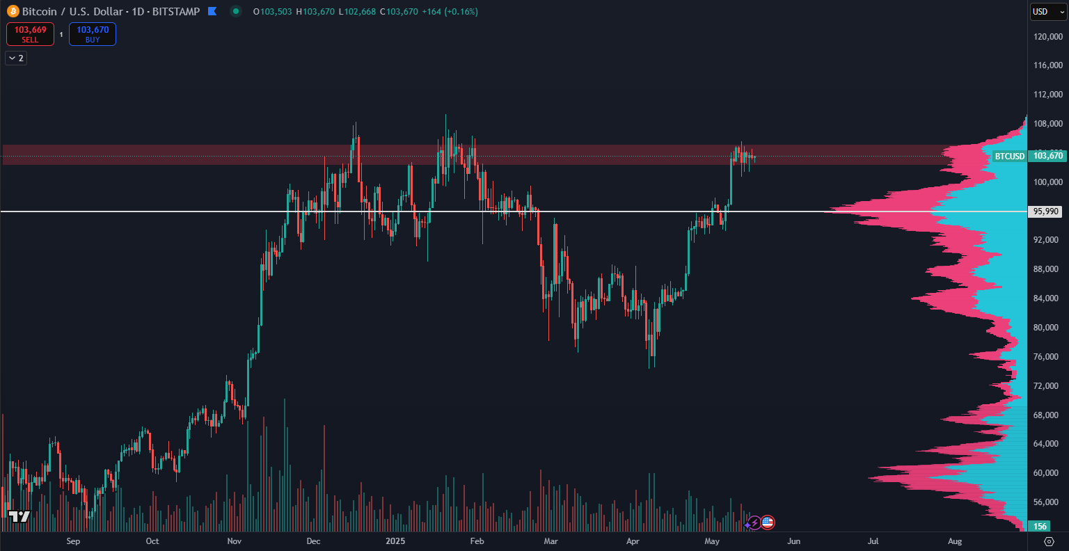 Cena Bitcoinu stagnuje už týždeň pri hranici 104 000 dolárov, čo predstavuje kľúčovú rezistenciu pred možným prielomom k novému historickému maximu, ukazujú údaje z TradingView. Predchádzajúci rekord bol dosiahnutý na úrovni 109 000 dolárov, takže trh pozorne sleduje ďalší vývoj.