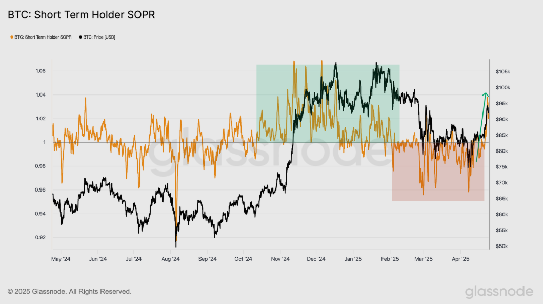 Spent Output Profit Ratio (SOPR) je ďalší významný ukazovateľ, ktorý poskytuje pohľad na správanie investorov a ich zisky z predaja Bitcoinov. Ak je SOPR nad hodnotou 1, znamená to, že investori realizujú zisky. V prípade STH SOPR, ktorý sa nedávno dostal nad úroveň 1, ide o jasný signál, že krátkodobí investori, ktorí nakúpili Bitcoin v posledných mesiacoch, teraz začínajú realizovať svoje zisky.