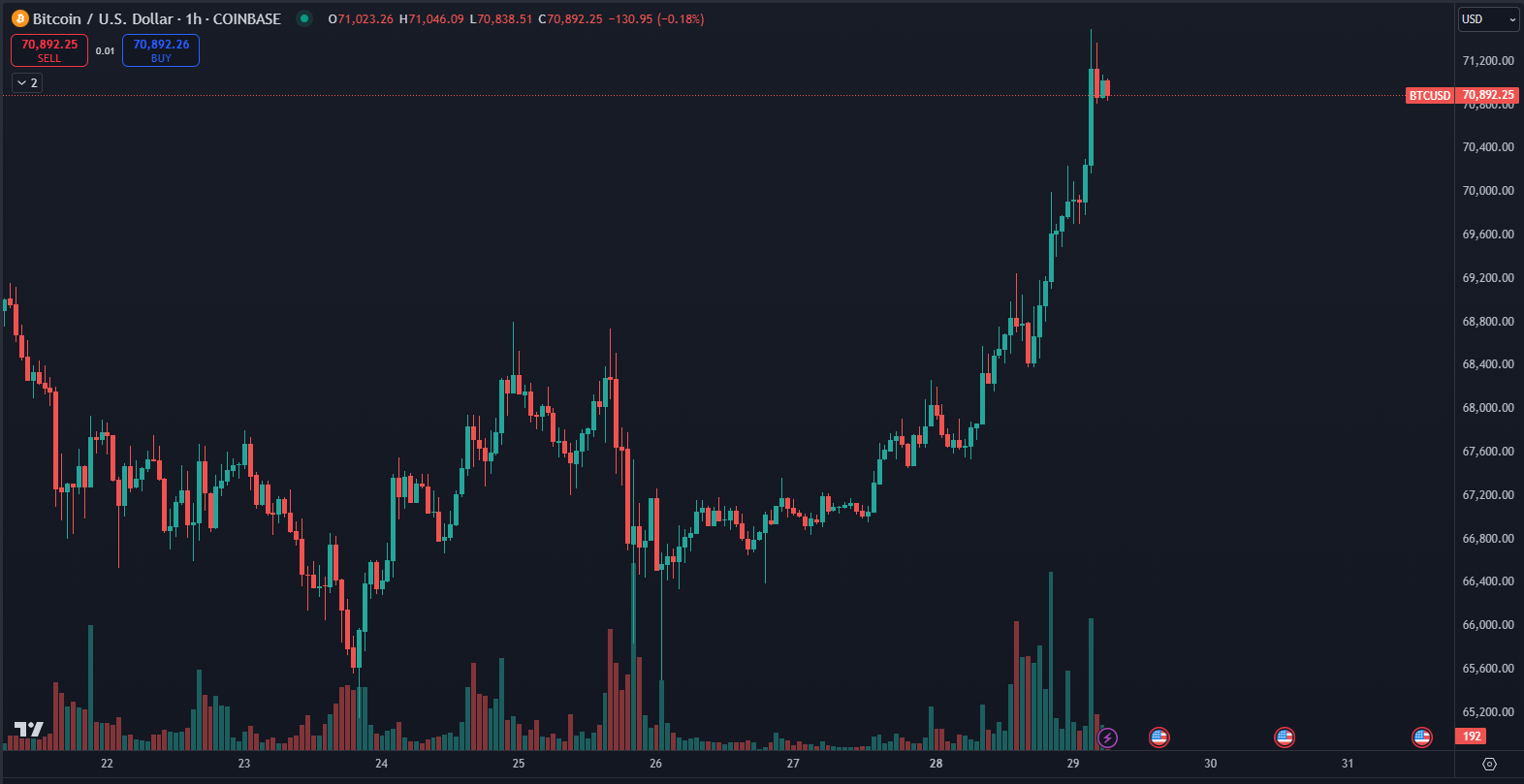 Ešte do včera nebolo nikomu jasné, či Bitcoin napokon dokáže ukončiť polročnú korekčnú štruktúru. Cena však zaznamenala výrazný vzostup, čím sa definitívne ukončilo obdobie strachu a pesimizmu. Najväčšia kryptomena na svete v čase písania dokázala vytvoriť nárast až na 71 500 dolárov, ukazujú údaje z TradingView.