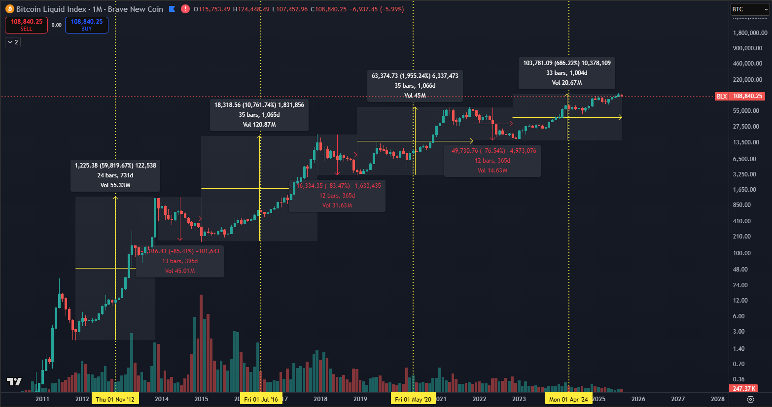 Bitcoin stále neporušil halvingové cykly. Zdroj: tradingview.com