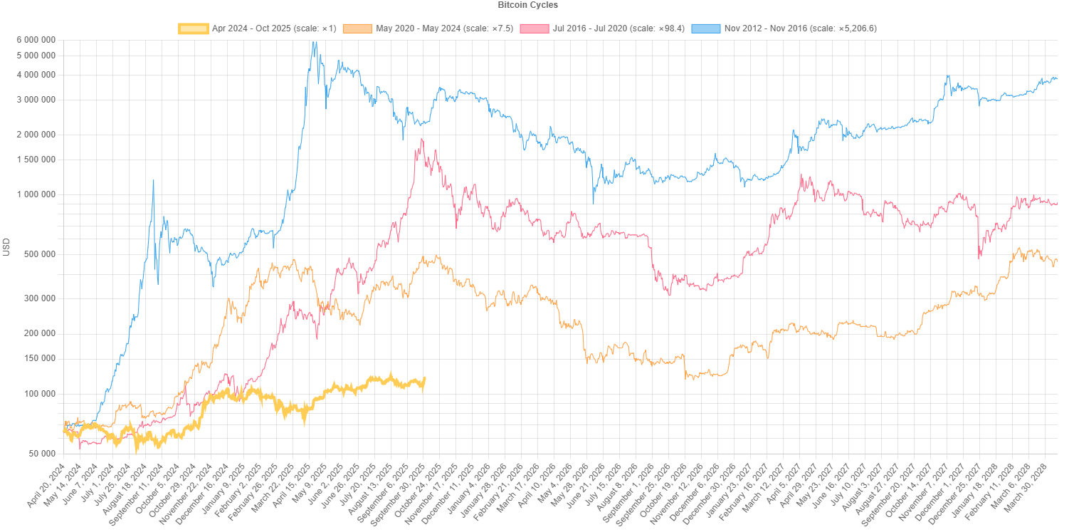 Podľa porovnania cyklov sa Bitcoin nachádza v záverečnej rastovej fáze, ktorá je typická rekordnými ziskami. Práve na tento moment čakalo množstvo investorov, pretože historicky predstavuje vrchol záujmu aj cien. Podobná fáza sa naposledy odohrala počas vzostupu v roku 2021.
