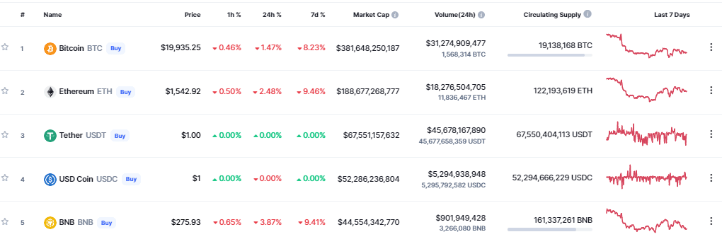 TOP 5 kryptomien. Zdroj: CoinMarketCap.com