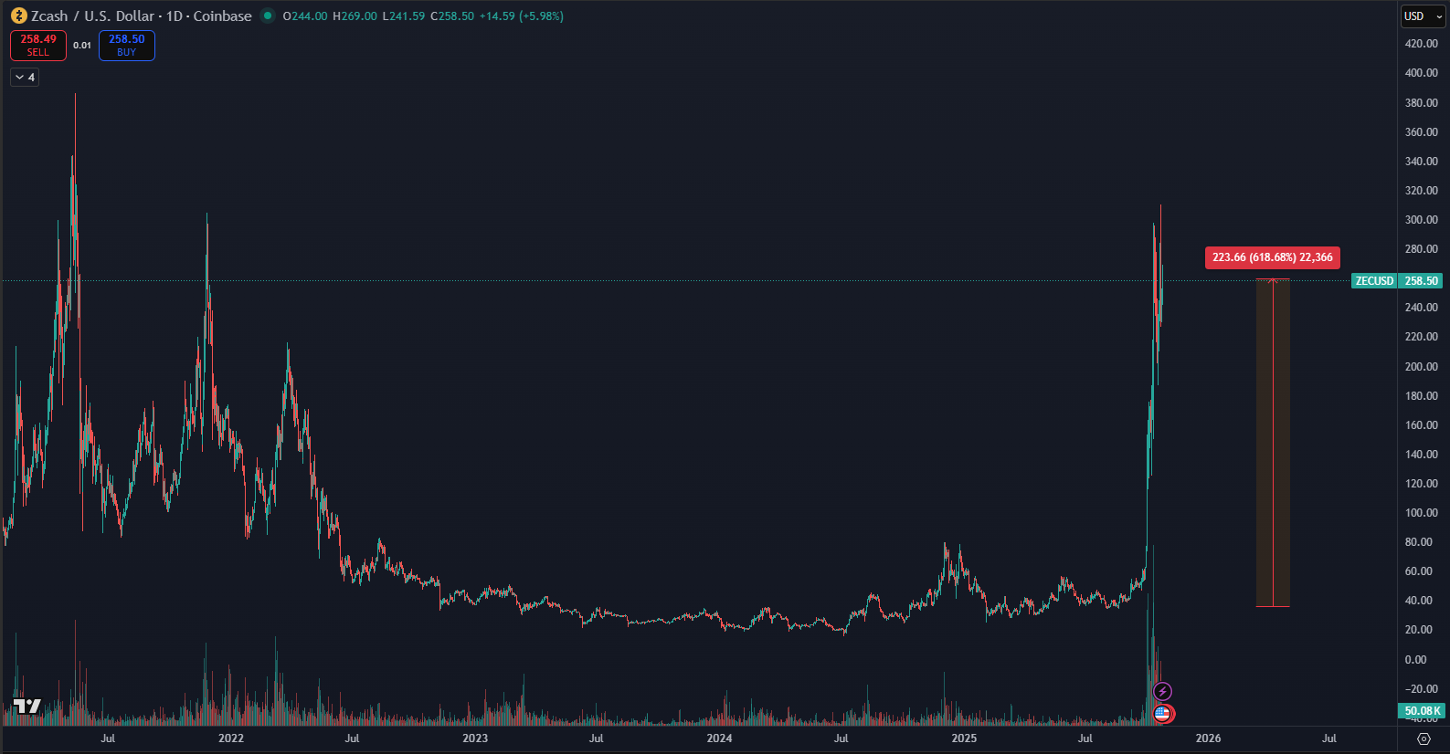 Kryptomena Zcash bola kedysi veľmi populárna. Ešte v roku 2021 zaznamenávala výrazné cenové pohyby a priťahovala pozornosť investorov. Následne nastalo 4 roky trvajúce obdobie ticha, počas ktorého väčšina trhu na ňu takmer zabudla. Teraz je však situácia úplne odlišná. Od leta tohto roku, podľa údajov TradingView, Zcash vzrástol o 600 %, čím sa dostal na najvyššie cenové úrovne od novembra 2021.