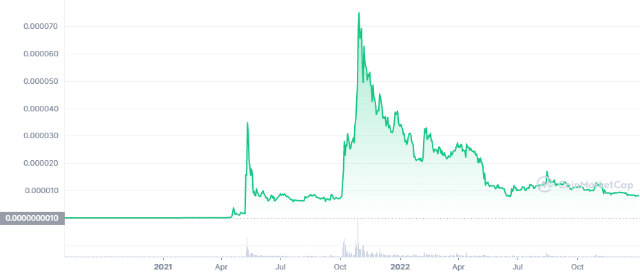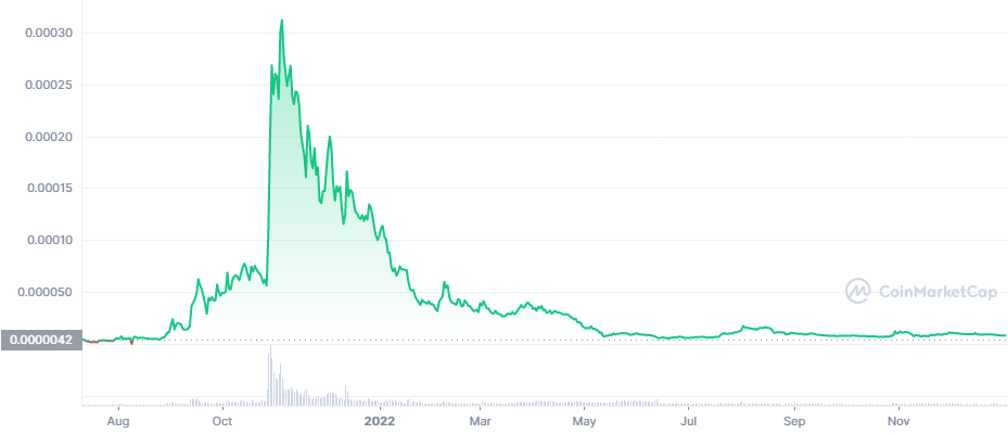 Floki počas svojho najlepšieho obdobia vzrástol o 1 000 %. Od roku 2021 jeho cena už iba klesá a je vysoko pravdepodobné, že projekt neskôr vymrie. Kto stihol nakúpiť pred veľkým rastom, tak mohol podobne ako v prípade prvých dvoch spomenutých kryptomien poriadne zbohatnúť na raste.