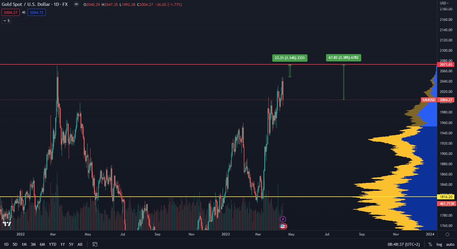 Zlato počas svojho posledného rastúceho trendu dosiahlo takmer nové historické maximum. Podľa údajov TradingView 13. apríla zaznamenalo vrchol na hodnote 2 048 dolárov. Táto hodnota bola naposledy sformovaná v marci 2022 kedy vojnový konflikt na Ukrajine stiahol všetky globálne trhy do hlbokej korekcie.