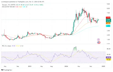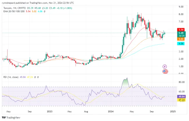 Toncoin (TON), kryptomena spojená s Telegramom, je ďalší altcoin, ktorý robí rozruch v roku 2024. Po poklese ceny začiatkom tohto roka Toncoin znovu získal momentum, ukazujúc známky prelomenia nad svojím júnovým historickým maximom 8,24 dolára. S cenou okolo 5,4 dolára ponúka Toncoin solídny vstupný bod pre tých, ktorí chcú diverzifikovať svoje portfóliá.