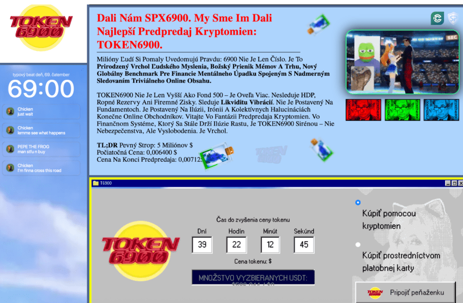 Ďalšou kryptomenou, ktorá stojí za zváženie, je TOKEN6900. Tento kryptoprojekt predstavuje vrchol „Brain Rot Finance” a popiera všetko, na čo ste boli doposiaľ zvyknutí. Nadväzuje na akciový index S&P 500 a token SPX6900, no svojím absurdným spôsobom. Neprináša žiadne sľuby, garancie ani falošnú transparentnosť.