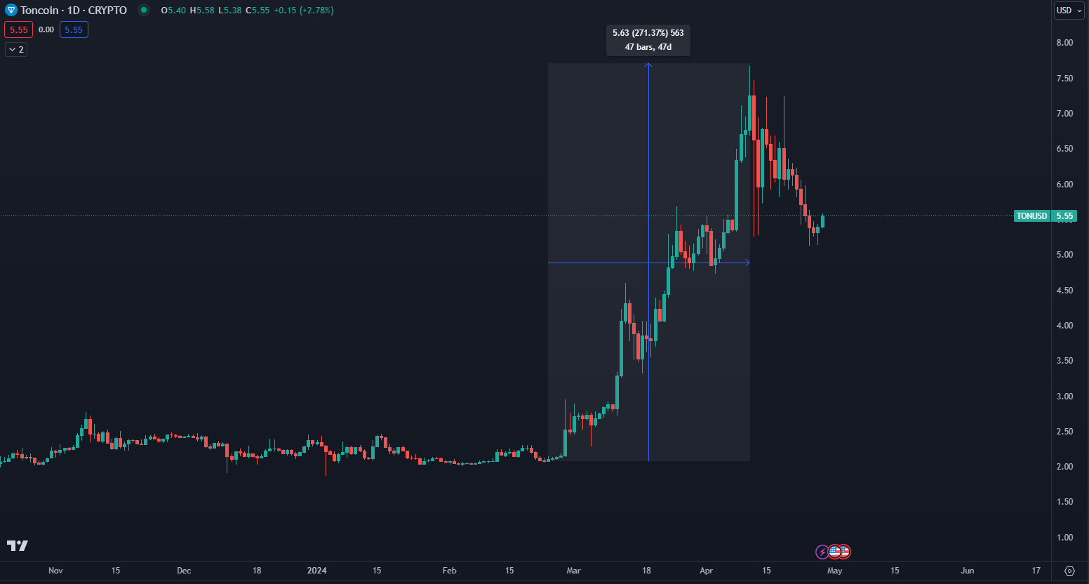 Toncoin stúpol len za 45 dní o 300 % a výrazne prekonal ziskovosť Bitcoinu. Ide o 9. najväčšiu kryptomenu na svete s trhovou kapitalizáciou 19 miliárd dolárov a denným objemom obchodovania 137 miliónov dolárov.