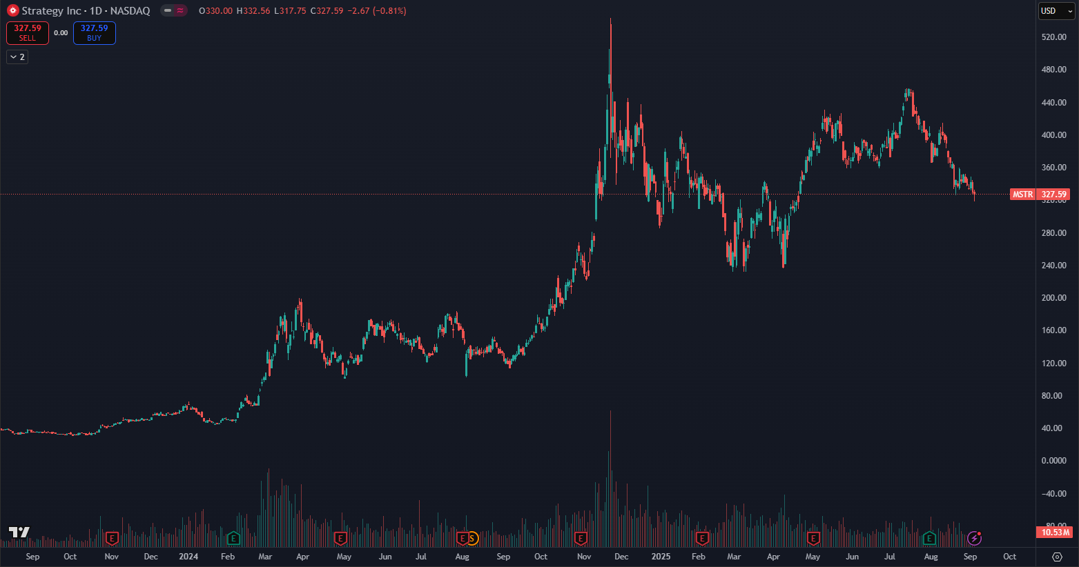Podľa údajov TradingView akcie Strategy výrazne korelujú s cenou Bitcoinu. Tento jav súvisí s obrovskou držbou BTC spoločnosti. V podstate nákupom akcií Strategy investujete nepriamo do Bitcoinu, čo umožňuje expozíciu voči digitálnym aktívam bez priameho vlastníctva BTC.