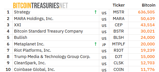 MSTR bola jednou z najvýkonnejších akcií roku 2024 a aktuálne drží 636,505 BTC v hodnote takmer 71 miliárd dolárov, ukazujú údaje Bitcoin Treasuries. Akcie majú trhovú kapitalizáciu tesne pod 98 miliárd dolárov, čo spĺňa základné kritériá pre zaradenie do S&P 500.