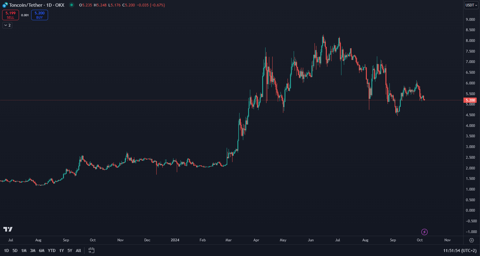 Toncoin spojený s Telegramom sa momentálne obchoduje za 5,20 dolára, čo predstavuje 9 % pokles ceny za posledných sedem dní. Vo štvrtok dokonca klesol na týždenné minimum 5,16 dolára. Napriek tomu to investorov neodradilo od nákupu altcoinu, čo demonštruje ich dlhodobú dôveru v rast ceny. Za posledných sedem dní čistý prílev veľkých držiteľov TON (rozdiel medzi mincami, ktoré veľrybie adresy nakupujú a predávajú) stúpol o ohromujúcich 1 698 %.