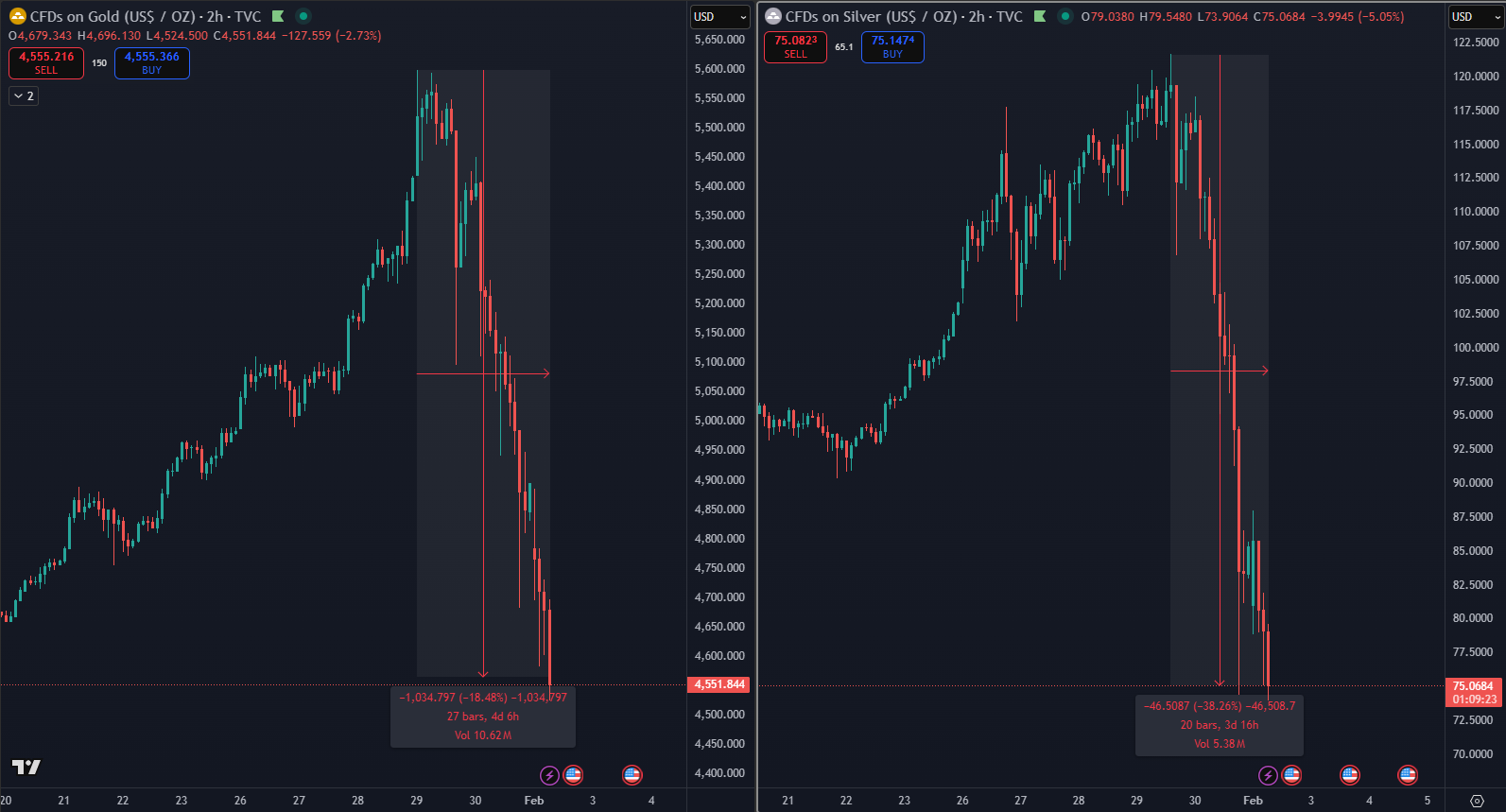 Zlato padlo o 18,50 % za posledné 4 dni, pričom striebro za rovnaký čas až o 38 %. Ide o historicky nevídané čísla, aké sme nevideli dlhé desaťročia a zrejme máloktorý investor si na niečo podobné pamätá.