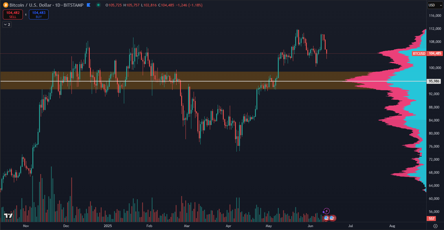 Supportné pásmo medzi 103 000 a 106 000 dolármi sa ukazuje ako kľúčová zóna, kde dochádza k zvýšeným objemom obchodovania. Práve tu sa v minulosti viackrát zastavil pád ceny, čo môže naznačovať potenciálne zotavenie alebo aspoň dočasnú stabilizáciu.