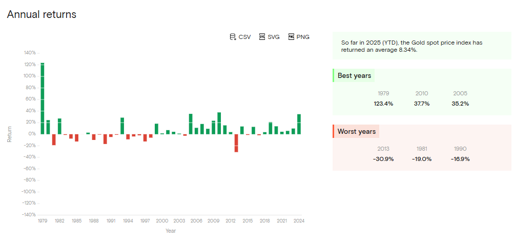 Štatistika ročných výnosov zlata. Zdroj: curvo.eu