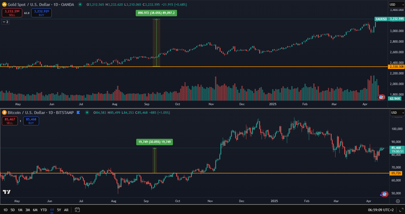 Zlato prekonáva výnos Bitcoinu. Zdroj: tradingview.com