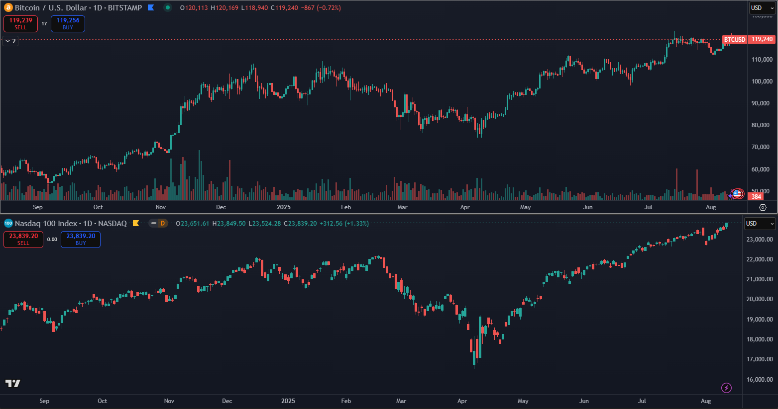 Nasdaq verzus Bitcoin. Zdroj: tradingview.com