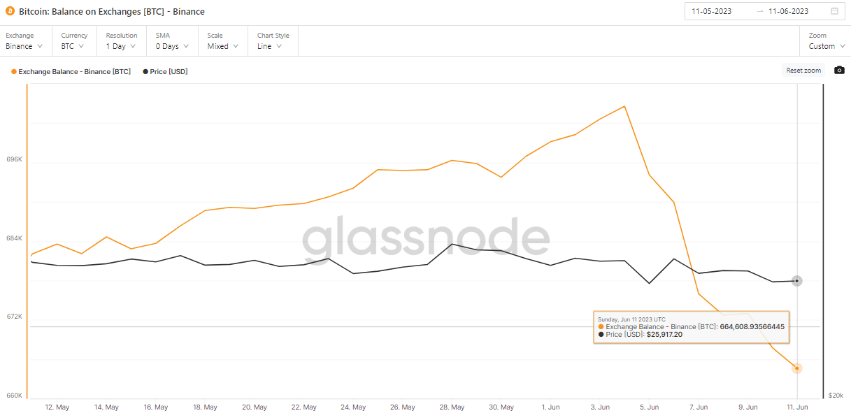 Podľa údajov Glassnode môžeme trend odlivu demonštrovať na bitcoinovej sieti v priebehu posledného týždňa. Od žaloby 5. júna z burzy Binance odišlo dohromady až 39 973 BTC. Najvyšší denný odliv sa vytvoril 7. júna s hodnotou 13 935 BTC. Je to najväčšia zaznamenaná hodnota od 13. decembra 2022, keď z burzy odišlo neuveriteľných 40 346 BTC.
