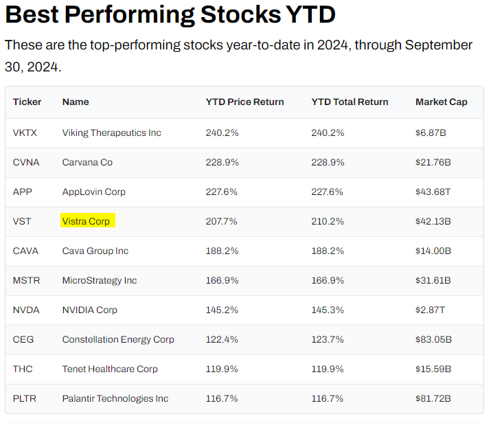 Podľa správy Finbold Vistra Corp. (NYSE: VST) prekonala očakávania a stala sa najvýkonnejšou akciou roku 2024. Táto texaská energetická spoločnosť zaznamenala ohromujúci nárast o 235,36 % od začiatku roka, čím prekonala aj populárnych technologických gigantov ako Nvidia či Palantir.
