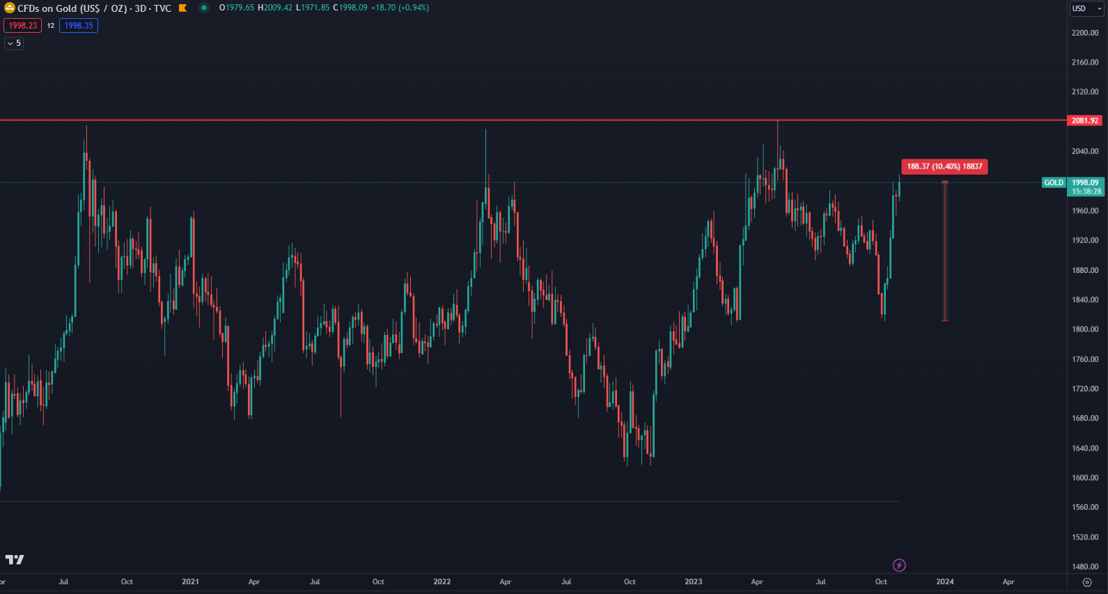 Zlato sa v čase písania článku obchoduje na cenovej úrovni 1 998 dolárov, čo je najvyššie od polovice mája 2023. Cena sa vyšplhala na 5-mesačné maximum po tom, čo takmer pol roka neustále klesala. Najnovšie údaje z TradingView však signalizujú, že čoskoro by sme mohli byť svedkami historického momentu, keď zlato vstúpi do nepreskúmaných cenových úrovní.