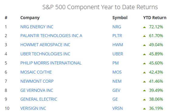 V čase písania sú akcie NRG najziskovejšie v rámci indexu S&P 500 v roku 2025, ukazuje rebríček Slickcharts. Od 1. januára dosiahli zisk +72,12 %, nasleduje Palantir (+61,70 %), Howmet Aerospace (+49,04 %) a Uber Technologies (+45,89 %).