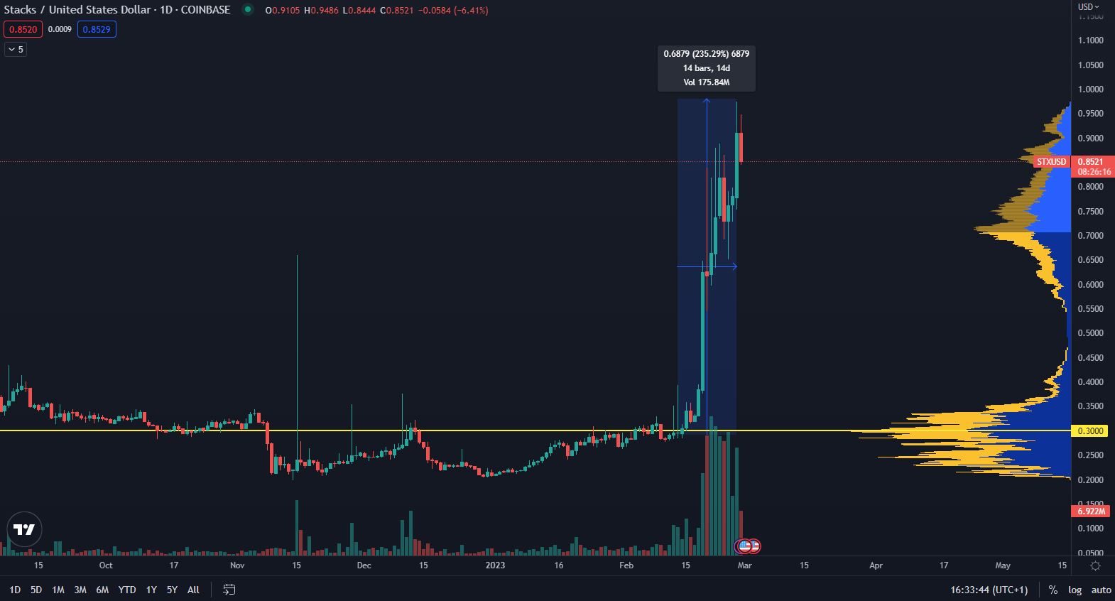 Ako vidíme na grafe podľa TradingView, cena STX stúpla za 14 dní o takmer 250 % a konsoliduje blízko lokálneho maxima. Naposledy sa trhová cena obchodovala na rovnakej úrovni v máji 2022 počas korekcie. Rozdiel je ale v tom, že obchodné objemy stúpli na rekordné úrovne a preto je pradepodobné, že trend bude pokračovať.