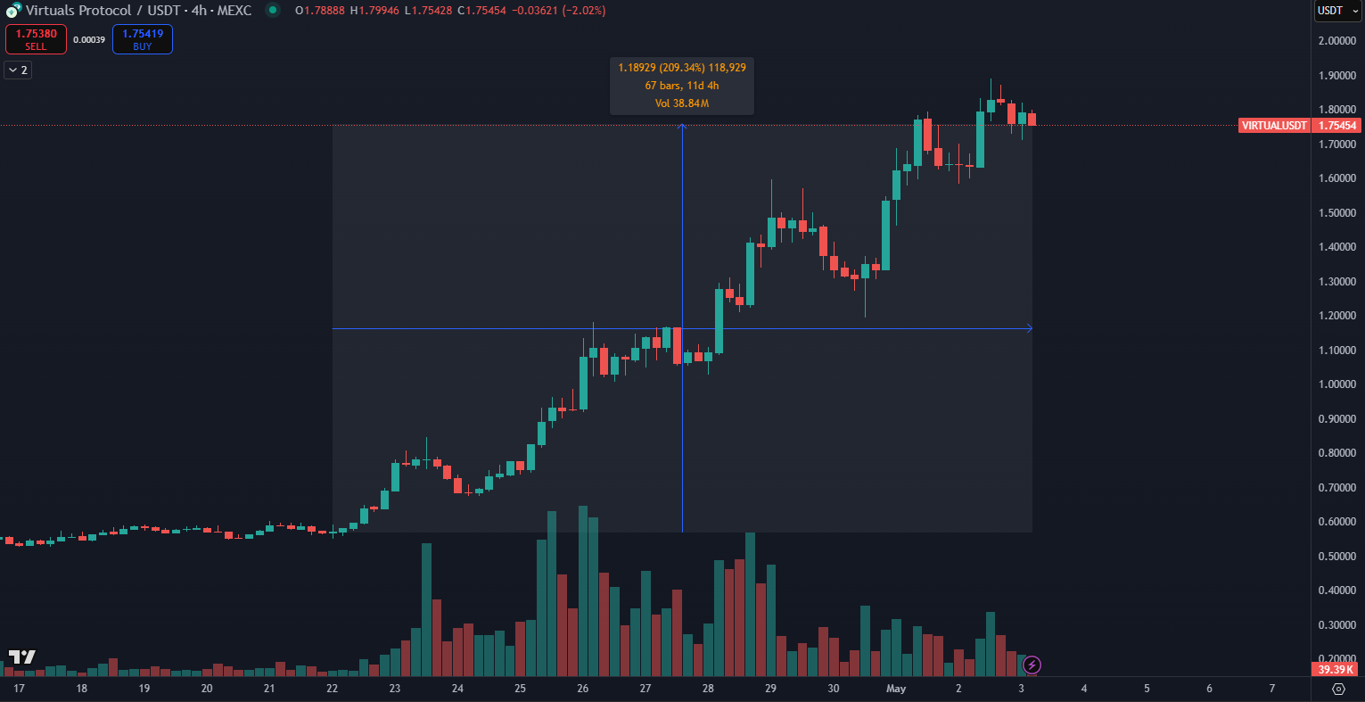 Kryptomeny zažívajú ďalší zaujímavý príbeh. Projekt s názvom Virtuals Protocol v posledných dňoch výrazne zaujal investorov aj verejnosť. Cena jeho digitálneho tokenu VIRTUAL stúpla za krátky čas o viac ako 200 %. Momentálne sa pohybuje okolo 1,75 dolára, ukazujú údaje TradingView.