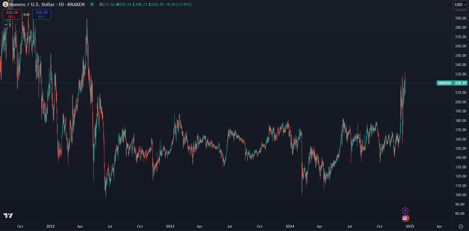 XMR zaznamenalo za jediný týždeň zhodnotenie o 50 % a vďaka tomu sa obchoduje na najvyššej cenovej úrovni od mája 2022. Za 2 a pol roka sme sledovali výhradne len akumulačnú zónu a cena sa neustále pohybovala na intervale od 100 do 180 dolárov. V čase písania dosahuje podľa údajov TradingView už 220 dolárov.