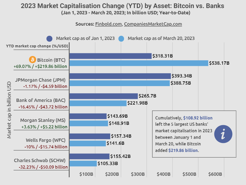 Bankový sektor je jeden zo základných pilierov globálnej ekonomiky a nedávne udalosti spôsobili krach viacerých spoločností. Podľa správy Finbold, investori hľadajú rôzne alternatívy, ktoré im pomôžu ukryť kapitál pred nákazou, ktorá postihla banky. Výsledkom je odliv trhovej kapitalizácie do rizikových aktív, ako je bitcoin.