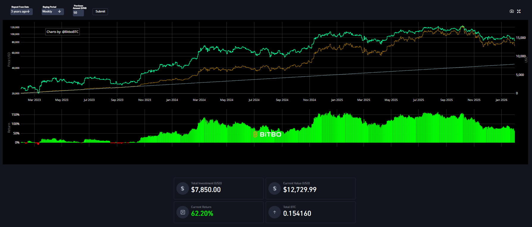 Podľa dát z analytickej platformy BitBO Charts investor, ktorý nakupoval Bitcoin každý týždeň za 50 eur počas posledných 3 rokov, dosiahol pozoruhodné výsledky. Celková investícia 7 850 eur vzrástla na hodnotu 12 729,99 eur, čo predstavuje výnos 62,20 %.