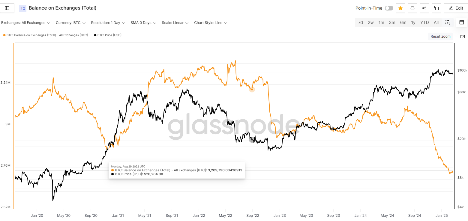 Podľa údajov Glassnode je na centralizovaných burzách stále menej Bitcoinov, v čase písania len 2,73 milióna (13,75 %). Toto číslo klesá neustále už 5 rokov. Navyše sa predpokladá, že až 6 miliónov mincí môže byť nenávratne stratených, takže skutočná ponuka nie je 21 miliónov mincí, ale omnoho menej.